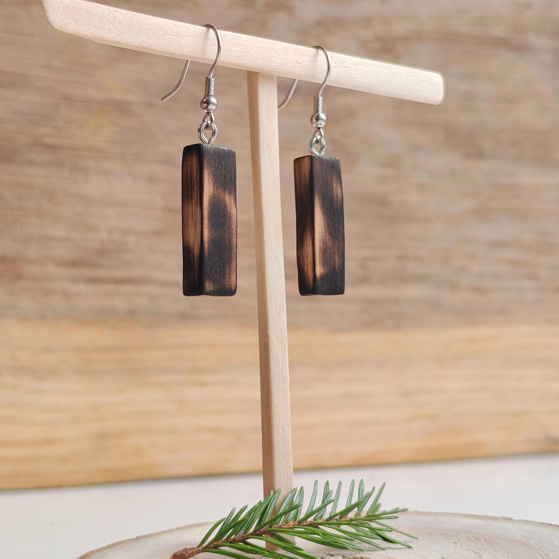 korvakorut hehkuvat luonnollista kauneuttaan polttosävytetyn puun kautta.