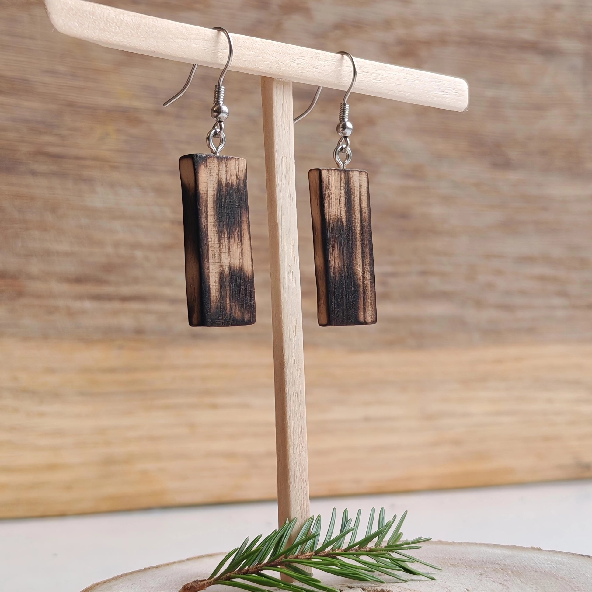 korvakorut hehkuvat luonnollista kauneuttaan polttosävytetyn puun kautta.